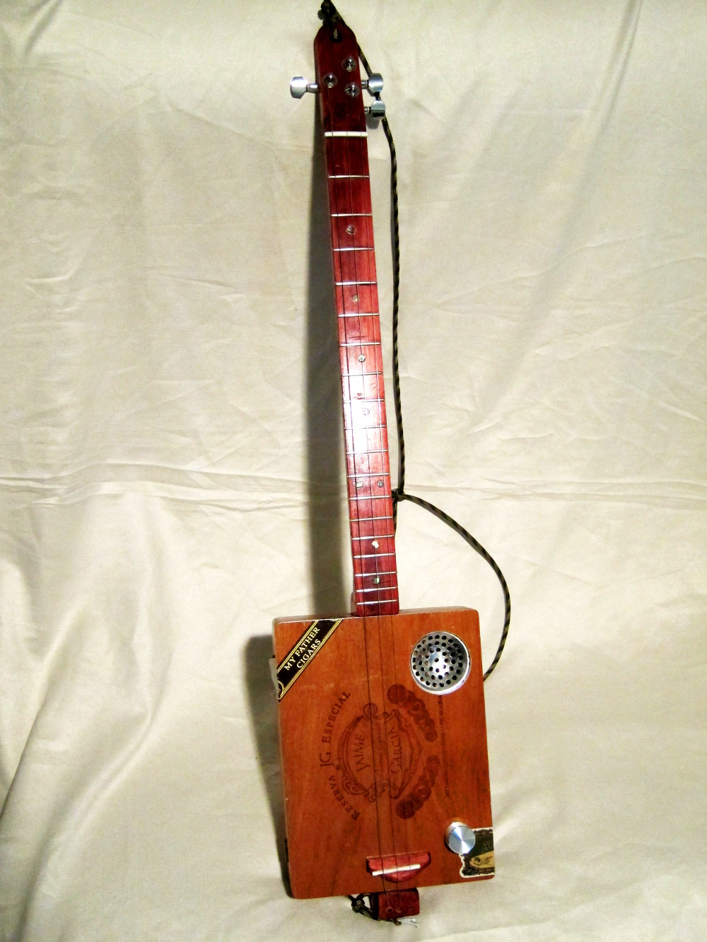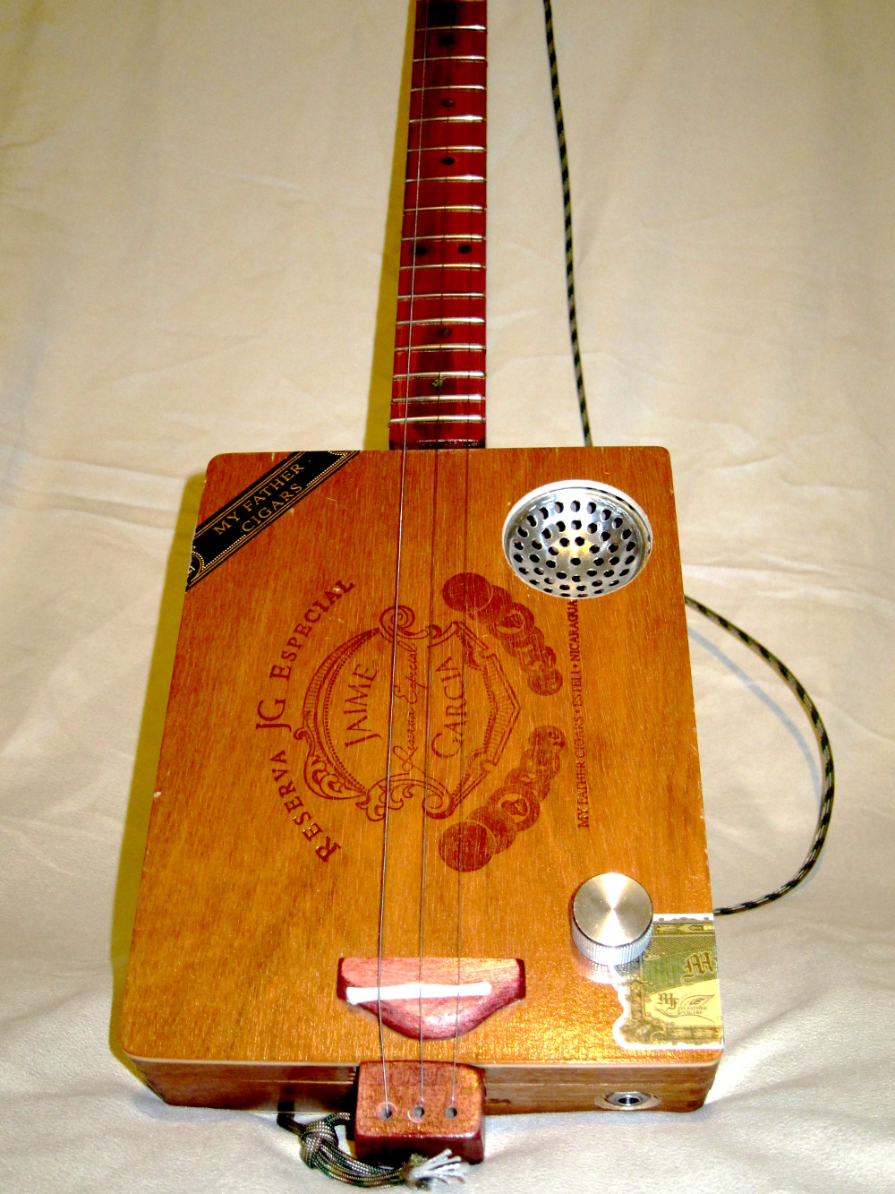 Sink drain sound hole and metallic volume knob gives this guitar its unique look. Low action and great tone.